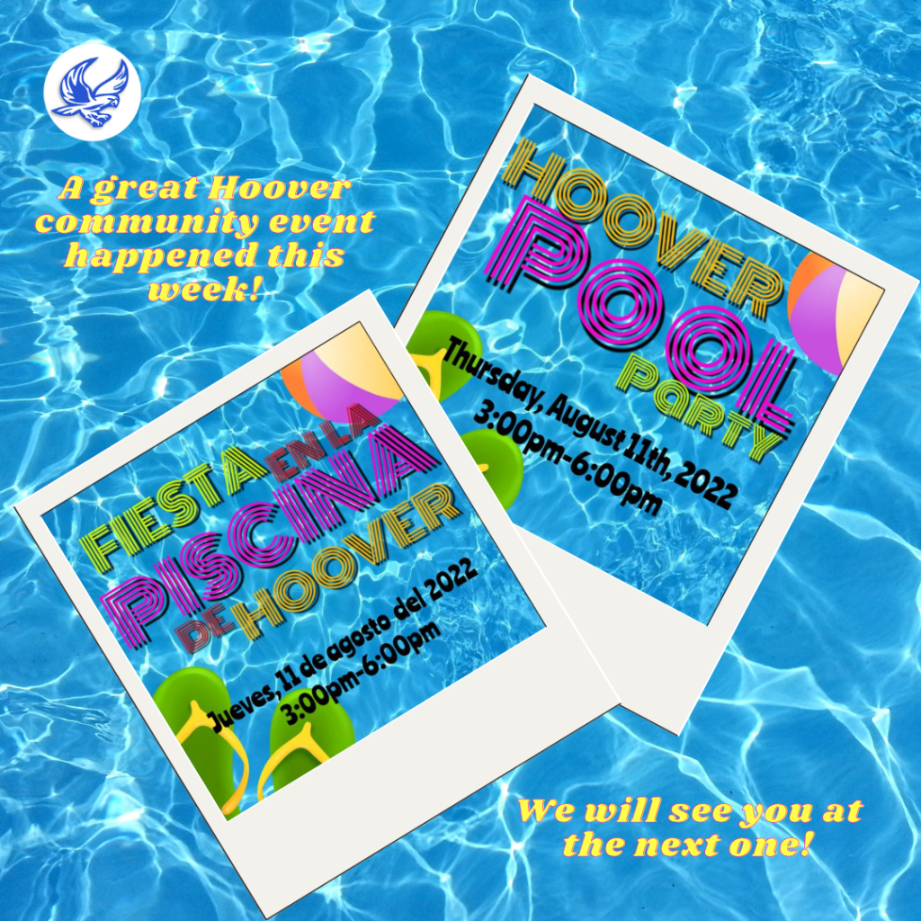 ¡Esta semana, la PTSA de la Escuela Secundaria Hoover organizó una divertida fiesta en la piscina de regreso a la escuela! ¡Los estudiantes y sus familias fueron invitados a venir y relajarse en la piscina Hoover antes del comienzo de clases la próxima semana!