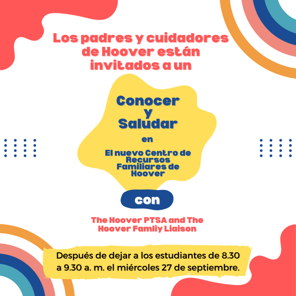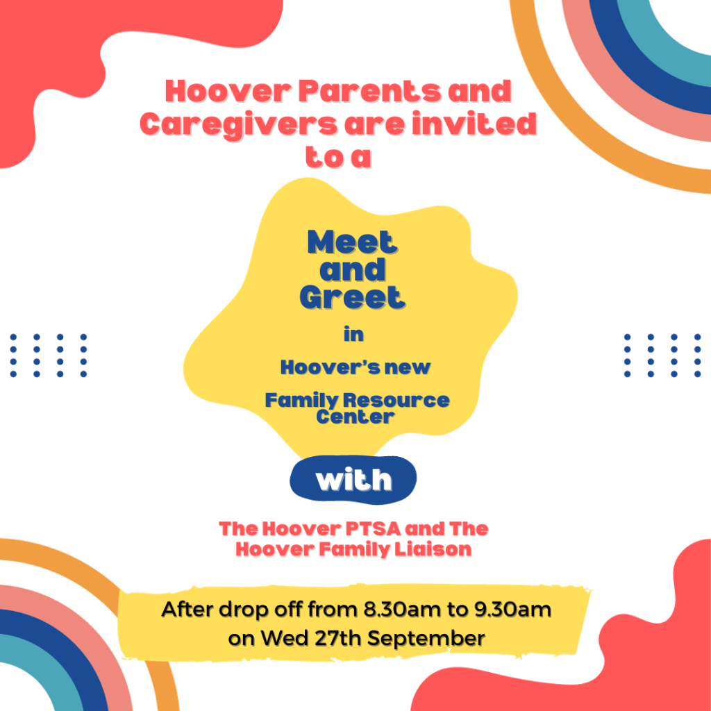 Debora Avalos our Family Liaison and the PTSA will be holding a monthly Meet and Greet! The first one will be at 8.30am to 9.30am, Wednesday the 27th in the Family Resource Center (Rm 75). This informal meeting is a way for parents and caregivers to meet us, have a chat and find out more about;