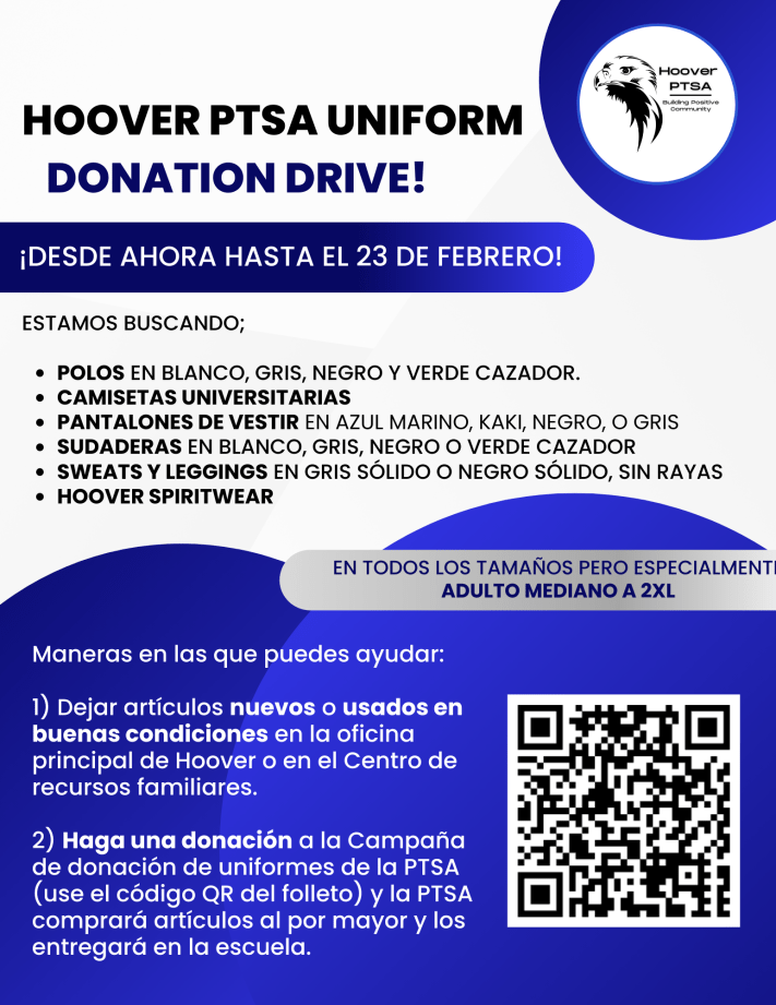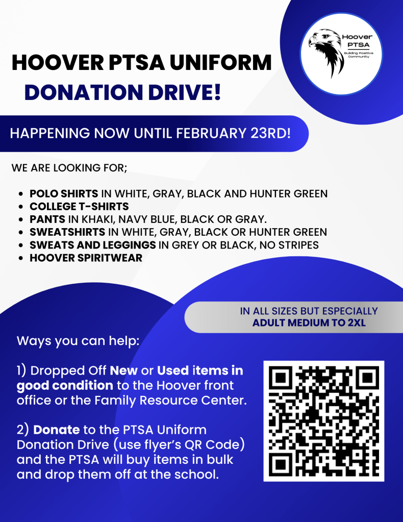 Have Hoover Uniform your students have outgrown? Would like to donate to our Uniform Donation Drive either with new items or a monetary donation and support our school community? Find all the information you need below!
