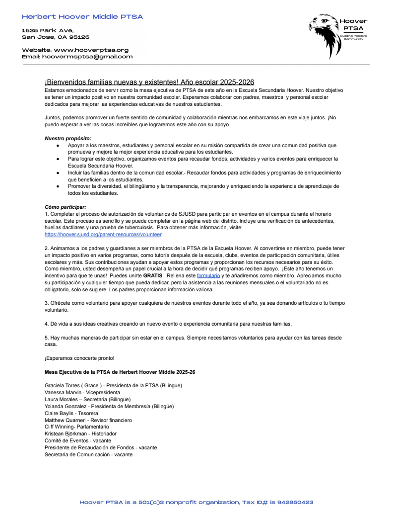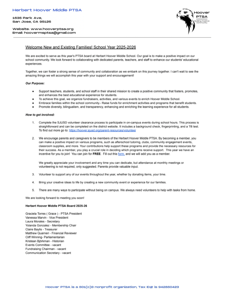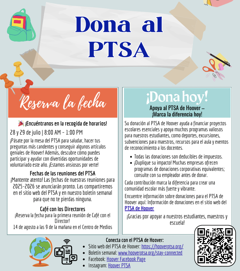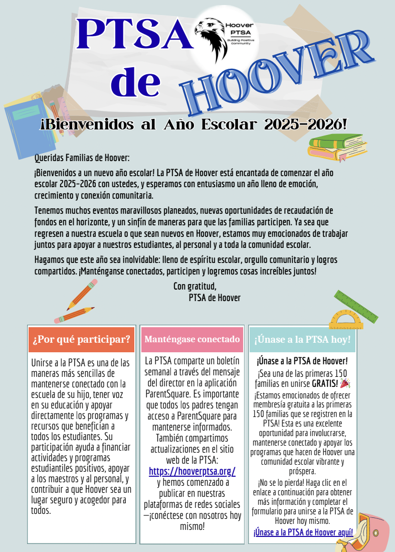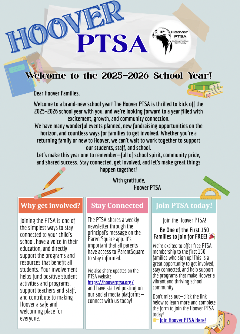 The 2025-26 School year is just around the corner and Hoover has published its summer mailer. We recommend you read it to find out lots of useful information before the school year starts. Below is the PTSA flyer and Welcome Letter included in the mailer.