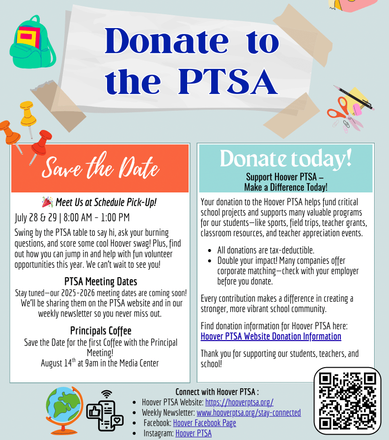 To every donor, every student, every family — THANK YOU for showing up and supporting our Hoover Hawks. Your donations directly support our students’ growth, learning, and leadership. As a Title 1 school, your impact goes even further. ![]()