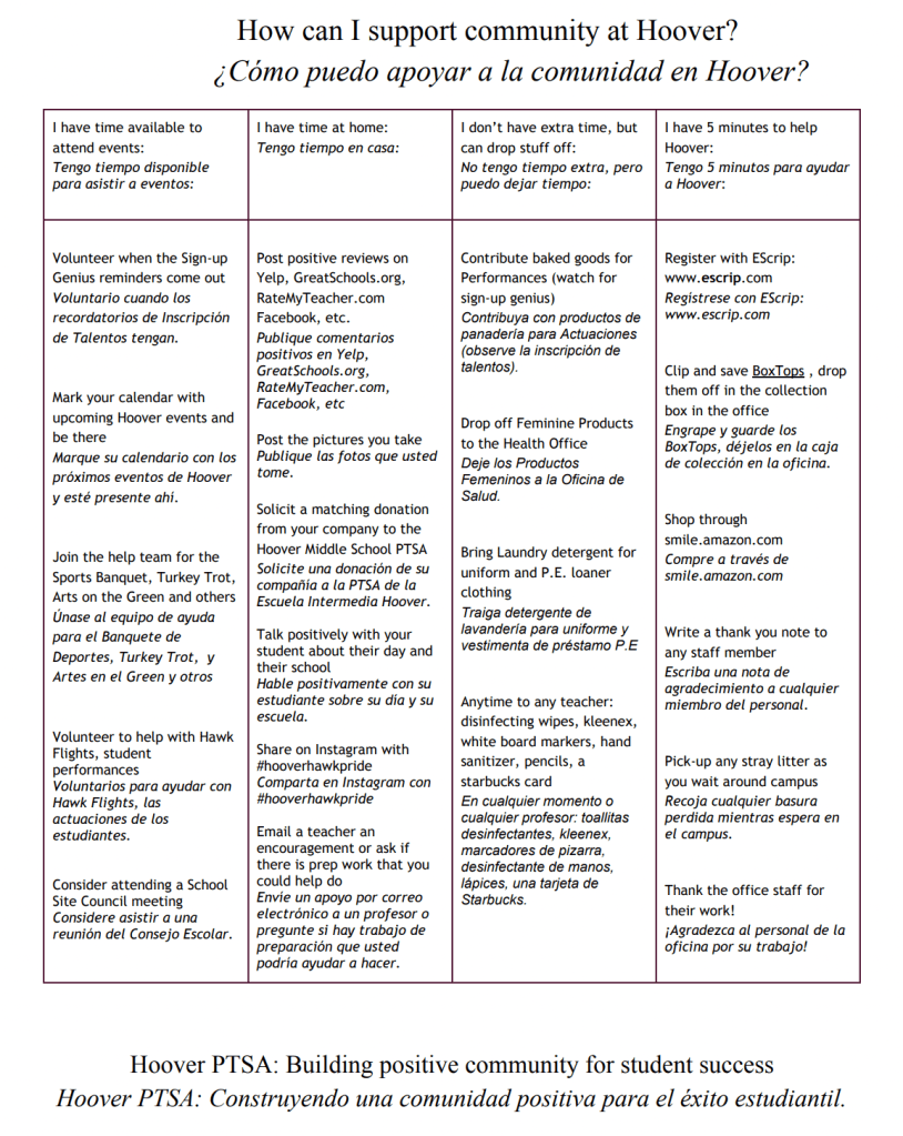 One of the best ways to help is to sign up to the PTSA mailing list and receive our weekly emails to find about events, activities and ways to get involved. www.hooverptsa.org/stay-connected